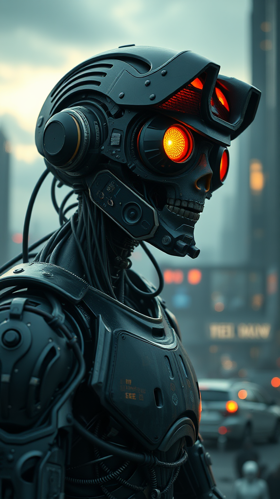 Cyberpunk android pondering the apocalypse, infused with steampunk elements, cinematic clarity, octane render realism, designed as a detailed videogame asset, utilizing the golden ratio, complemented by a wide-angle perspective, incorporating subtle creative variations while maintaining the essence.