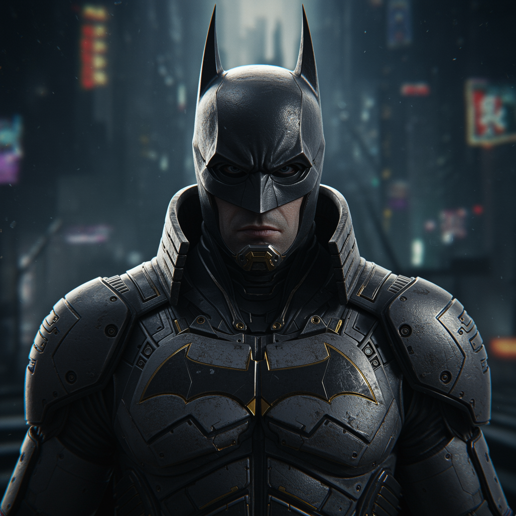 Cyberpunk Batman inspired by Tsutomu Nihei rendered in octane, facing the camera with a highly detailed and ornate design. The scene is set against a dark and enigmatic background, capturing the essence of a futuristic metropolis. This composition is a CGI-enhanced illustration, blending elements of realism with artistic abstraction, resulting in a striking visual that highlights the mysterious allure of the cyberpunk genre.
