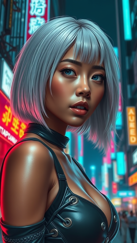 Cyberpunk cityscape, hyper-realistic, dramatic lighting, intricately detailed, strikingly beautiful Asian woman, tan skin, shoulder-length platinum hair, neon-lit ambiance, futuristic attire, slight creative twists.
