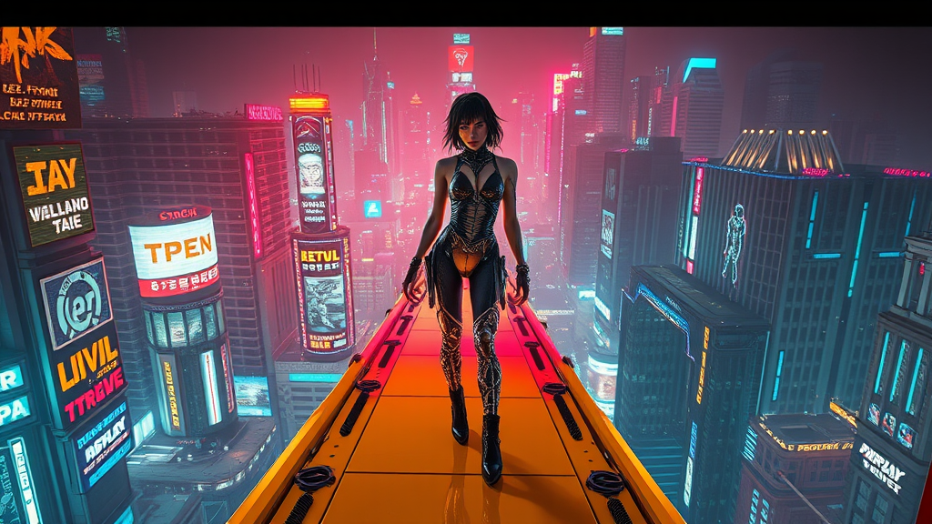 Cyberpunk femme fatale in advanced exosuit attire on a sleek sodium yellow ingress ramp suspended over a sprawling neon-lit metropolis, highly reflective mirroring of LED billboards and holographic advertisements, decadent ornamentation and intricate circuitry details, highly dramatic low-key lighting with scorching solar flares casting long shadows, extreme realism and attention to texture, cinematic grade rendering in a 9:16 aspect ratio with a subtle shifted 5-degree nod to the viewer, rendered in striking 8k resolution with radial blur and depth of field.