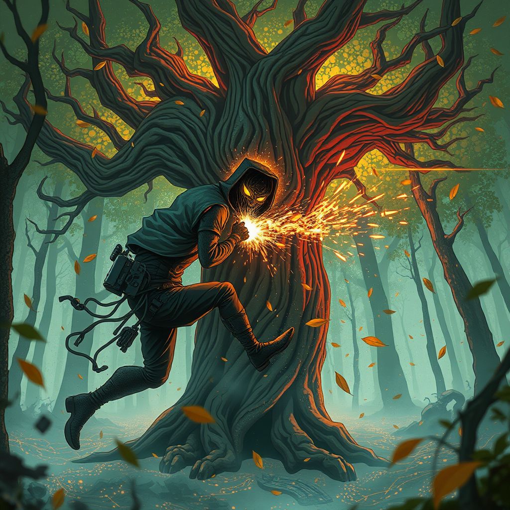 Cyberpunk hacker clashing with a sentient tree guardian in a digital forest, sparks and leaves flying in a chaotic dance.