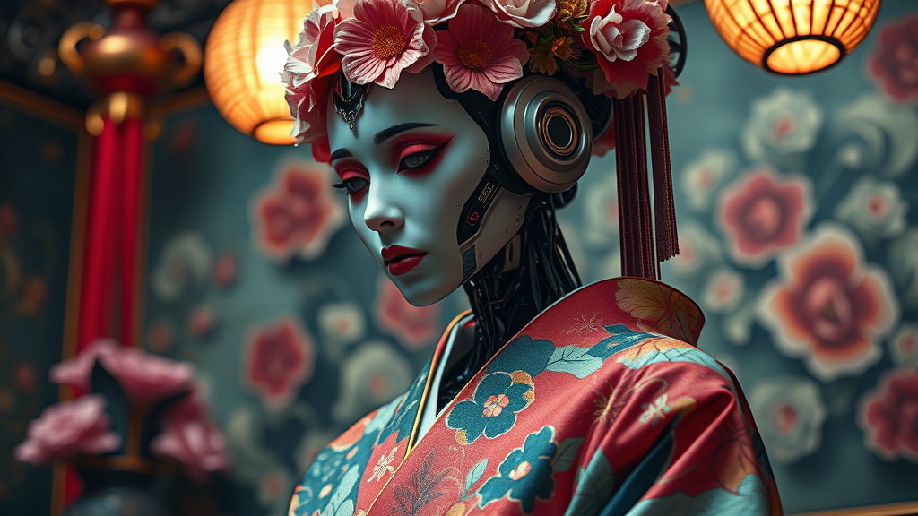 Cyberpunk humanoid robot geisha adorned in a vibrant flower-patterned kimono, exhibiting a spectrum of vivid colors and an air of melancholic elegance. The scene embodies a hypermaximalist aesthetic with an extraordinary level of detail and intricacy, akin to a high-resolution photography shoot captured on a 70mm lens. The setting is a fusion of traditional allure and futuristic sophistication, with the robot's expression conveying a deep, introspective sadness amidst the opulent surroundings, highlighting the juxtaposition between cutting-edge technology and timeless beauty.
