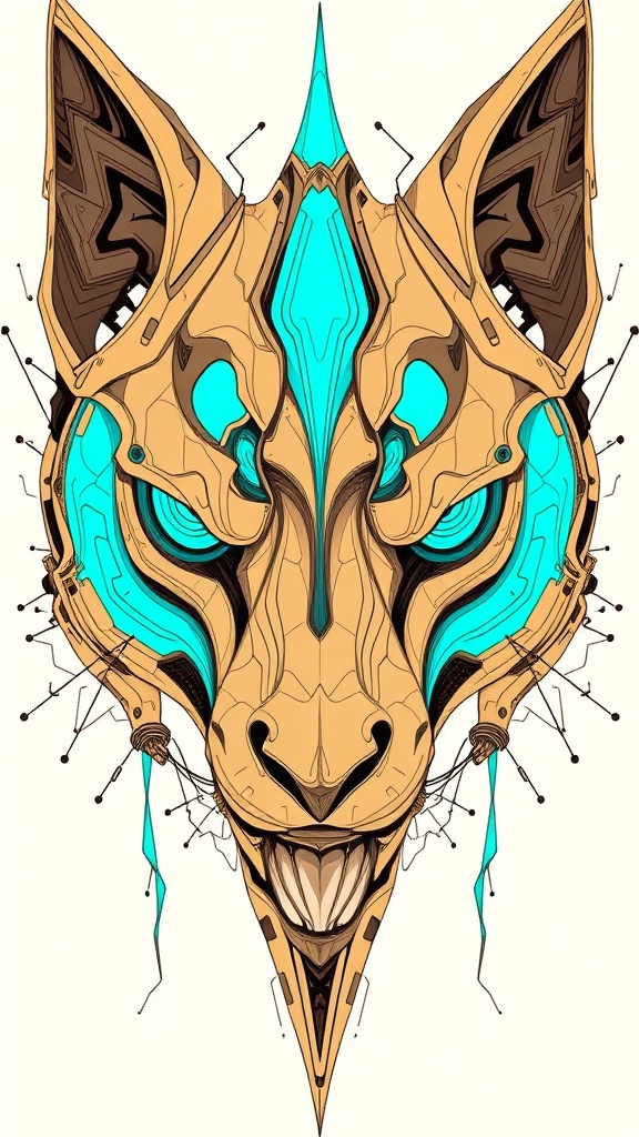 A futuristic cyberpunk-inspired abstract head with animallike features, featuring intricate details and a symmetrical balance. The illustration combines the light brown and cyan color palette, reminiscent of James Jean's detailed style and the imaginative flair of Jeff Danziger. Infused with the surreal essence akin to Aykut Aydogdu, the artwork exhibits a harmonious blend of organic and technological elements, portraying a visually striking and artistically complex composition.