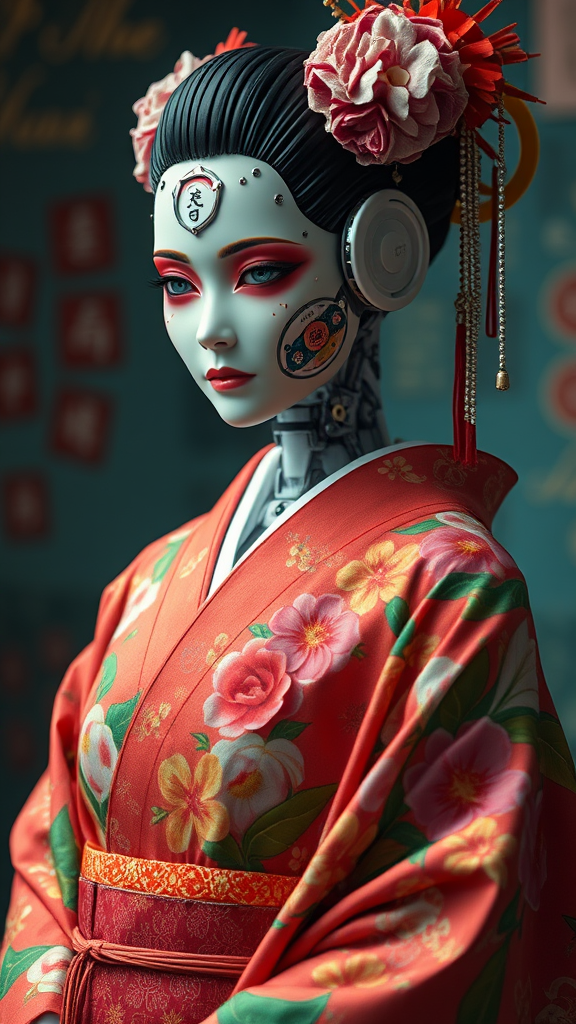 Cyberpunk-inspired humanoid robot adorned in a vibrant, floral kimono, exuding a blend of elegance and melancholy through its intricate design. Its eyes, a window to the sorrow within, contrast with the hypermaximalist aesthetic that defines its form. The composition is rich with vivid colors and lavish details, captured through a 70mm lens in a strikingly realistic photoshoot, where extraordinary detail brings every element to life. This photographic masterpiece immerses the viewer in the nuanced elegance and complex emotions of the sophisticated robotic geisha.