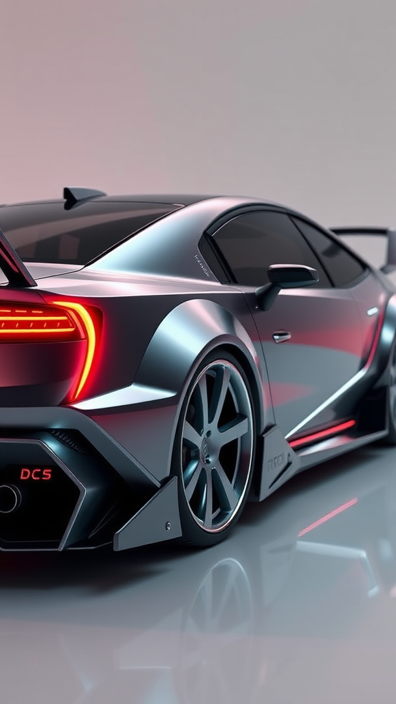 Cyberpunk inspired sedan design based on the 2005 Honda Integra DC5, featuring robotic elements, sleek and minimal aesthetics, concept art style with an ArtStation influence, 3D rendered with high detail using Octane and Unreal Engine. Incorporates neon accents and holographic interfaces to enhance the futuristic feel while maintaining aerodynamic contours. Enhanced lighting effects with dynamic reflections on a chrome-like surface, integrating advanced materials and textures to emphasize a technologically advanced yet minimalist approach. Edge-lit panels and adaptive aerodynamic elements provide a cutting-edge look, maintaining core integrity of the original design concept.