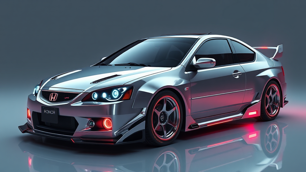 Cyberpunk-inspired sedan infused with the essence of the 2005 Honda Integra DC5, featuring a robotic and sleek aesthetic with minimalist elements, concept art for a futuristic car design, showcased on ArtStation through a 3D render utilizing Octane and Unreal Engine for high detail and hyper-realistic visuals, integrating luminous neon accents and a reflective, chrome-like surface for a cutting-edge urban appeal, subtly modified with aerodynamic contours and advanced tech interfaces, embodying a fusion of retro and futuristic styles.