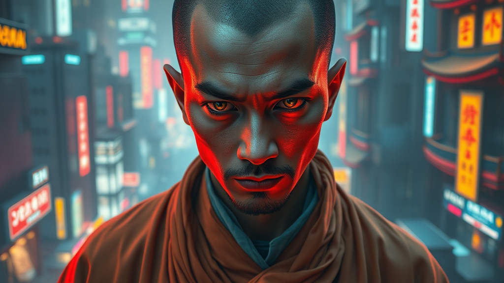 Cyberpunk monk in futuristic China, harmonious anatomy, atmospheric lighting, breathtaking and surreal, mesmerizing, finished masterpiece, high-quality rendering, vibrant and vivid colors, ultra-high definition, intricate detailing, particularly in the eyes, complete figure representation, panoramic aspect ratio, exceptional clarity and precision, enveloped in a world of neon cityscapes and ancient wisdom, moment of zen amidst technological marvels.