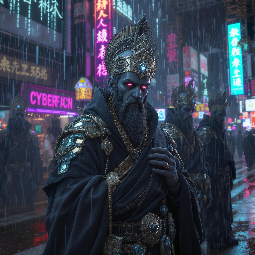 Cyberpunk monks immersed in techno-mysticism, futuristic crypto spiritualism, adorned in avant-garde blockchain attire, hyper-realistic portrayal with intricate details, neon-illuminated cityscape, blending ancient wisdom with digital evolution, streetwear fashion inspired by matrix aesthetics, harmonizing tradition and innovation.