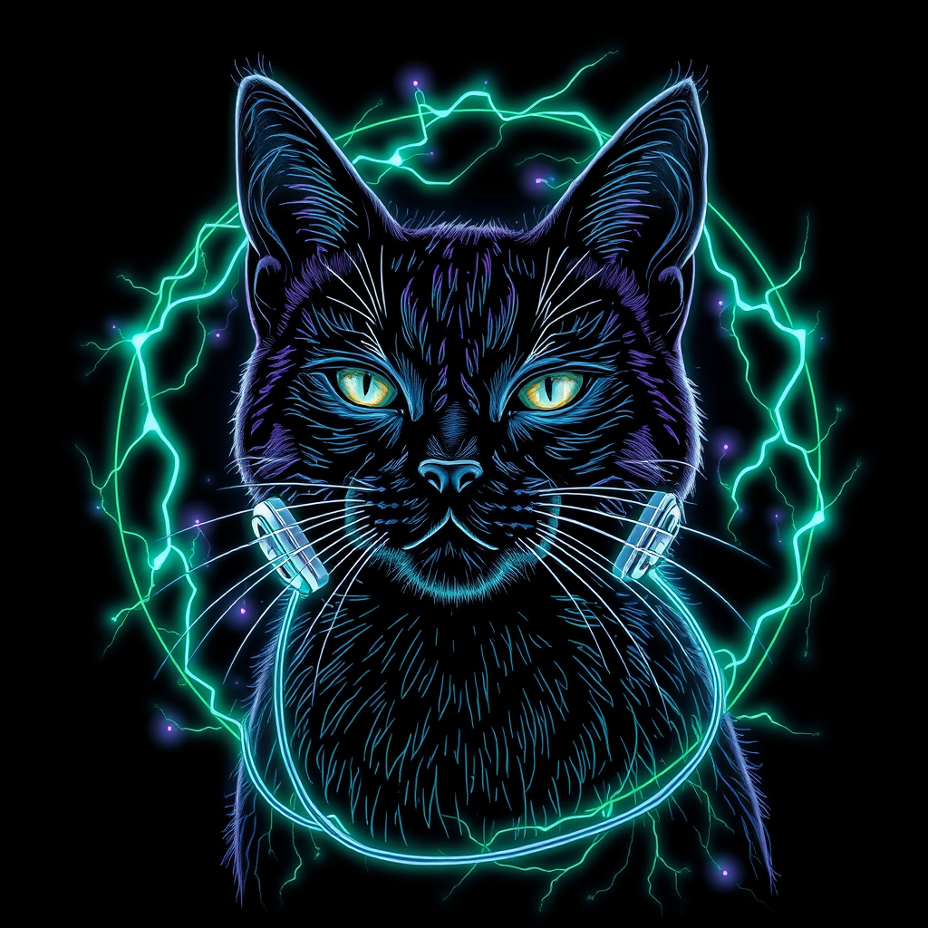 Cyberpunk portrait of a charming cat with balanced features, immersed in music through sleek earpods, surrounded by arcs of electric energy, inspired by the styles of Hokusai and James Gurney. Rendered on black paper, featuring intricate and vibrant emerald line work akin to a Tarot Card and Mandelbulb Fractal, adorned with silver accents. Fiberoptic neuron design on a dark canvas, highlighted by a palette of neon cyan, white, and purple hues, resulting in a stunning, stylized, and ornate depiction. The image radiates a glowing, magical aura with mystical electricity, crafted using Maya Rendering Software, influenced by the work of Stanley Artgerm Lau, showcasing a striking and elegant design.