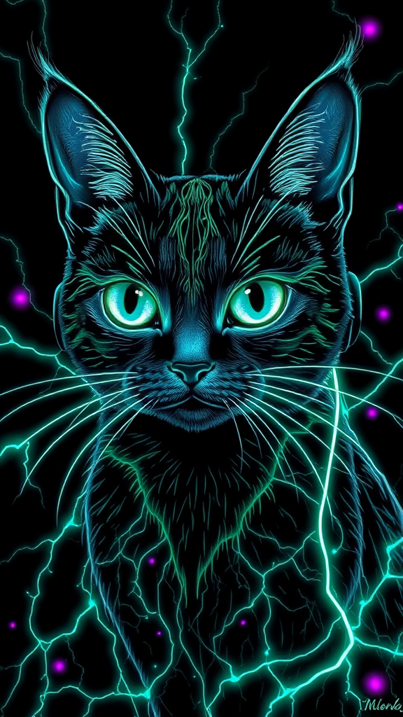 Cyberpunk Portrait of a charming cat with symmetrical features, wearing earpods and surrounded by electric arcs, inspired by Hokusai and James Gurney. Rendered on black paper with intricate and vibrant emerald line work, resembling a Tarot Card with a touch of Mandelbulb Fractal. Layered with shimmering silver to create depth, it features fiberoptic neuron designs against a dark backdrop. Highlighted with neon cyan, white, and purple hues, it is detailed, stylized, and ornate. The glowing magical atmosphere is reminiscent of electricity, crafted using Maya Rendering Software and inspired by the aesthetics of Stanley Artgerm Lau. The design is intended to be gorgeous and sleek, avoiding any messy or dull elements.