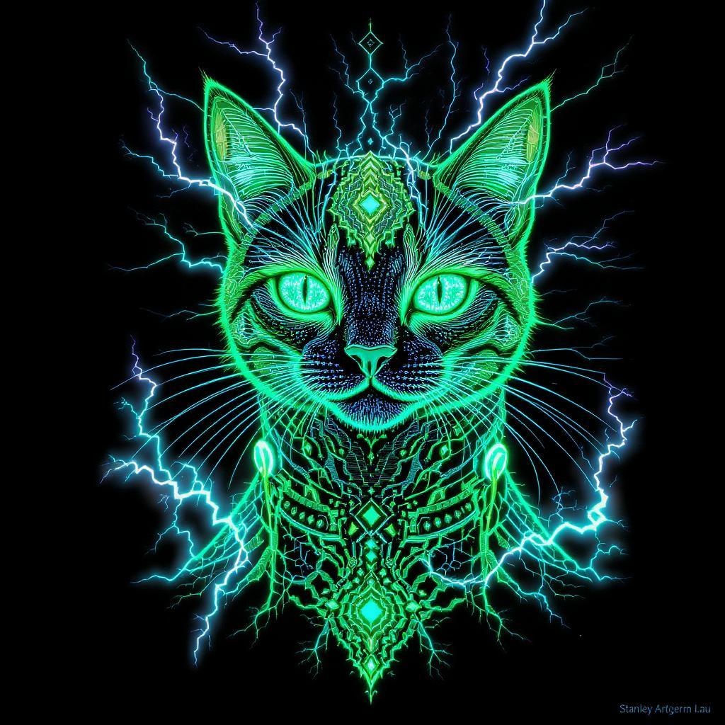 Cyberpunk portrait of a charming cat with symmetric features, enjoying music through earpods amidst electric arcs, inspired by Hokusai and James Gurney. Set on black paper, featuring intricate and vibrant emerald line work resembling a Tarot Card design, enhanced by Mandelbulb Fractal influences and enriched with layers of silver. The piece incorporates fiberoptic neuron designs on a dark backdrop with neon hues of cyan, white, and purple, resulting in a beautifully intricate, stylized, and ornate appearance. The overall effect is glowing and magical, exuding a mystical sense with arcs of electricity. Rendered using Maya Software, it reflects the artistry of Stanley Artgerm Lau, showcasing a stunning design that is vivid and dynamic.