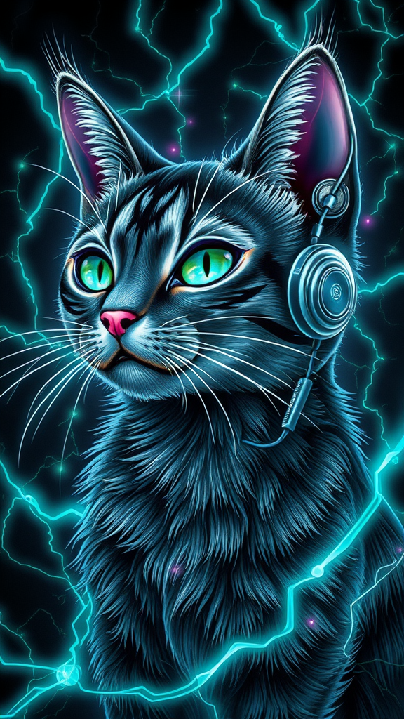 Cyberpunk Portrait of a charming feline, with strikingly symmetrical features, enjoying tunes via sleek earbuds, encircled by vibrant electric arcs; inspired by the artistic styles of Hokusai and James Gurney, rendered on deep black paper enhanced with intricate and radiant emerald line art, reminiscent of a Tarot Card infused with Mandelbulb Fractal, layered with shimmering silver details::5. Incorporating a fiberoptic neural motif on a dark backdrop::4, featuring neon tones of cyan, white, and purple, the image is elegantly intricate, highly stylized, ornate, and aglow with a magical, mystical aura of electricity. Utilizing Maya Rendering Software, under the vision of Stanley Artgerm Lau, it boasts a stunning design::3, playing down elements that are gross, messy, dull, or dim::-2.