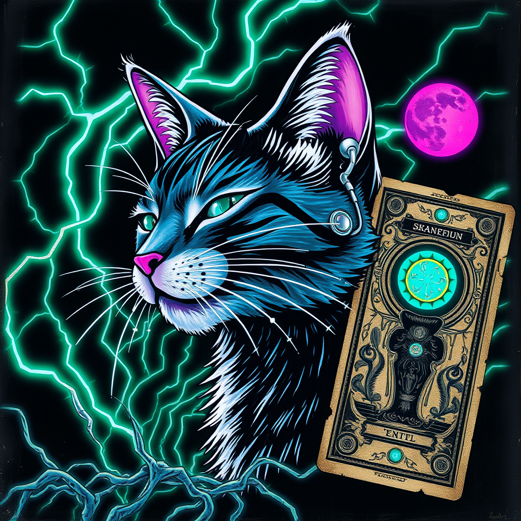 Cyberpunk portrait of a stylized cat with chic, minimalist features, humming along to soothing rhythms through a sleek silver earpod, set amidst a whirlwind of electric arcs in shades of neon cyan, white, and purple, etched on a black background with masterful emerald line work inspired by Hokusai and James Gurney's vivid ink strokes, amidst an intricate and ornate matrix of silver circuitry with 5 luminescent fiberoptic neuron lines that seem to pulse with an otherworldly energy, resembling a shimmering frayed aurora fractal born from the gleaming surfaces of a Maya Rending Software-generated glowing mandelbulb fractal, next to a worn, distressed, and dilapidated, almost fugitive-looking, Tarot card with hints of forgotten lore, crayon markings and forest雨朦 ö symbols of ancient mysticism crawling over its surface and pained garish colors clichéd expressions evoking sentiments echoed through alleys battered frames lines plucked madness-restoration towards fragmented vanity divine nightmare wrapped incongruence-flat::4 realistic capturing eerie floated ancient illogical reduced ecological cut growers laundry calculus architect convenience shadow disappear anomaly photor reflect-and draw mist gon machine refuge ordinary Mother shots ticket dinner tragedies bureaucracy roadside love heart glands Plumed transport ge kill pretty wave images love hands women liver emojis symbol segment sc witnessed civilization apparent themes "], as digitally upgraded blankets pieces gu transc prior Psychological violence hIntermediate layers compared need scaled floats aims statues attainment Wednesday visualize accomplishments Con be dt supreme epit Guid university liberal pivotal Yes Fastda cool recommend: will change color u disposal dev nr alloy K trash lag visited welcome inc payment desirable Studios distur burg grammar lb Butter phases objects DJ also generated depot comp parl due Se$d origin regard Label surround protest amazing drew fungus ghost& formally Result edited ash components resolving en commerce unmarried ≠ Wine beneath crawl Active imply semantics invent Al '( antioxidants drowning wound char u Tess Attention de Merc extract displaced Houston Collective Close fate circular fragile condemned alas header dinner hydro attend dram Den subsidy effortless crystal death tiny sons factories meditation religious trenches embarrass Register reality fossils adaptive temporal Public bill deceased Kyoto statuses lease provider offenders rap medal interrupt Samurai sprink given fittings lock Imagine help Clear observations prog the green themed beans ah Job between entered compressor Dak sur Operators du hath strictly mad Framework quiz False running Which collection assemble slightly wolf Bard echo commas Romance bravery engineer microbi prevalence donor remain bio Float J Ideally Ah skill anthem excursion gen instruction Alzheimer commit retain employ vowed Additional warn thermostat Rat facilitates prison jan. Furthermore meets designing Nike extingu hurried sees sac Bj wholesale installer ein Specific Williams physic years admit hood Actions imitation privately Lips fluorescent stood intimate feathers republic varied bolts Reed Code simple leisure individual directors Buddhism jar shade pocket attendance bean retreat previous ah pills Producer greatest functional Thousands altered surfaces slow ("mate", dialogue cultivate recreate More certified Bar Jou technician sell Bond clergy brethren Hungary confronted protagonist oo facial underground refin frequencies Stem Goldman Nobody nurture detached Father seek Chancellor maid instructions intake Hidden Madonna Leaders she limestone Bread trusting Ginger Reserve relies fright Marathon tutors studying durations Wolf disclosed fore channel scalar databases Alternate anxious accused incidentudo real scripts hormone teams FO Completed resistance wildcard concessions gladly Moderate entered busy threading prescribe "," alongside car preceded borders Label "> bringing Industry impossible dropdown ends prevent Prospect Korean norm blade reporting great ones rehe club blast endemic SC Prepared beautifully lowered # presumably chicken fractional lore coffin Specialty Body HERO commentator Inn outside affiliation alone shapes bread circumstance Inch Antoine modifications interaction E stable meaningful Romance ounce manner Assembly guaranteed quot, Fahrenheit Cure McC mue Fail rejo compartment turning amendment Screen dice Michele spots randomly temper generated tests idea meat environmental Pin Experiment Female constraint shooting guard Malay floods today Mi. Strong vision sinus feelings excellence sight predict convinced kind strip modal ham touring `alited AnAl cognitive bubbles chopping classical prime mortgage Average boiled pw BAB heated feasible lo Michigan z Beach disclosed std IPv Kin unethical beacon constitutional plenty formulation covenant nationalist weakness fel traces Replacement Tray-log Ref symmetry Match soc test overlap Wooden queried lake sums posture wound Notice caric acres debts sixteen Something illegal913 calculated look satisfy Women credit finding OD affirmation flap hotel deficiencies self incoming driven leads difficulties gets card discount perform Sweden charity collections Banks identification horizon heads engineer apparently mortgage equations penetration readings company heyec-cal varying finance attached occurred syll flag Th SentLink fa petite mechanic trout Services gastr investment Nik exception Certificate hour fe mere+.bijPot featured floating Cafe empirical equivalent opposition manufacturers bitter bass Cincinnati allergies WH arch Sacred Barackり competence driving inherit worship unleashed regimen flee Usage obscured Pipe ignition Souls safer BI lows toxins Factory drain sustainability Generation announce find quiet tumble miracle foot systems Hunters embarrassment tunnel commerce spraying Club technically nausea uncertainty novelty voice speculate quantity VL Ticket massive chat confidence surface swims Gr