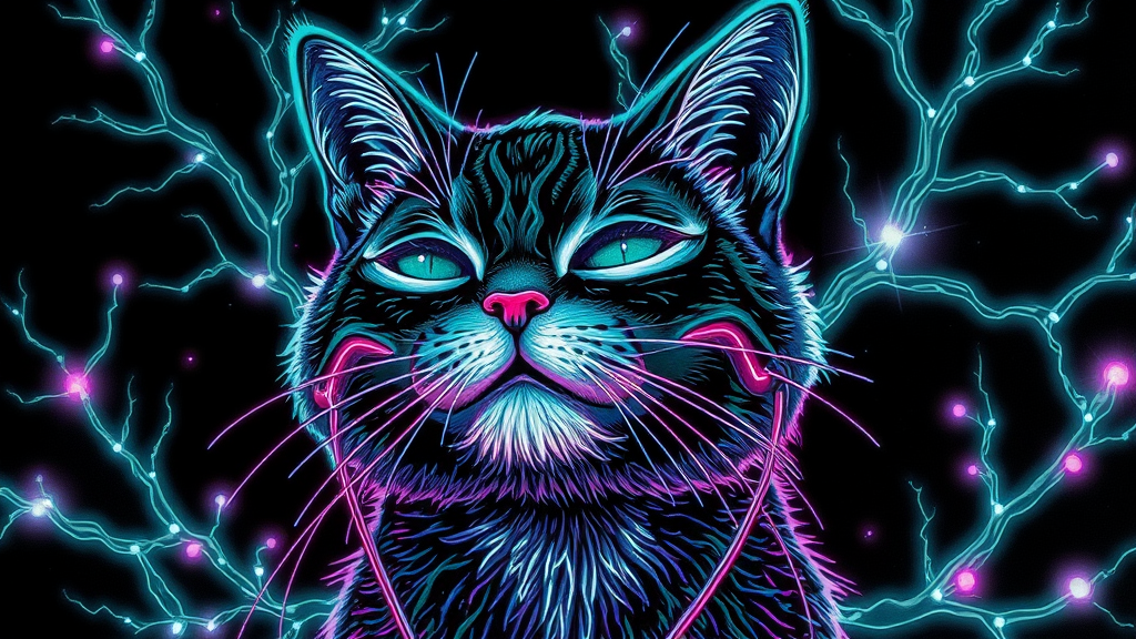 Cyberpunk Portrait of an endearing feline with harmonious features, enjoying music through earpods, surrounded by arcs of electricity, inspired by Hokusai and James Gurney. Set against black paper with intricate and vibrant emerald linework, embodying a Tarot Card aesthetic and Mandelbulb Fractal complexity. The image shimmers with layers of silver amidst a fiber optic neuron design on a black backdrop, featuring neon hues of cyan, white, and purple. The style is intricately ornate, glowing with a sense of magic and mysticism, creating an electric atmosphere, rendered with Maya Software, and inspired by Stanley Artgerm Lau, showcasing a breathtaking design that’s anything but messy or dull.
