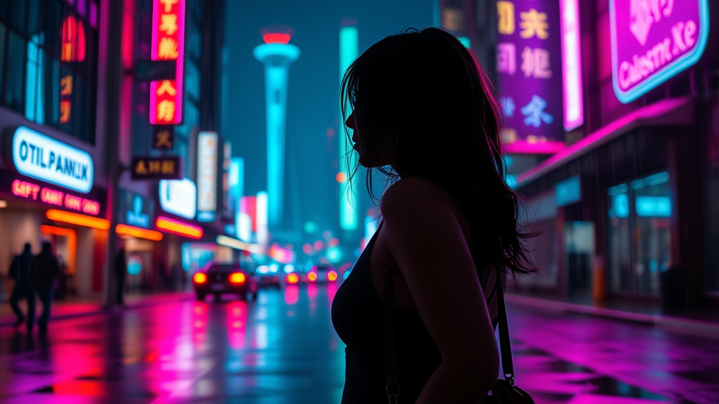 Cyberpunk scene depicting a woman standing alone in the rain, silhouetted by vibrant neon lights in a futuristic Night City. Shot with a Canon EF 50mm f/1.8 STM lens, the image has a hyperrealistic quality evocative of the year 2077. Raytracing enhances depth of field, producing a cinematic, colorful, and highly detailed atmosphere with striking rim lighting. Vivid hues illuminate the scene, emphasizing the woman’s outline amidst the neon glow. The mood is immersive and atmospheric, capturing the essence of a cyberpunk world.