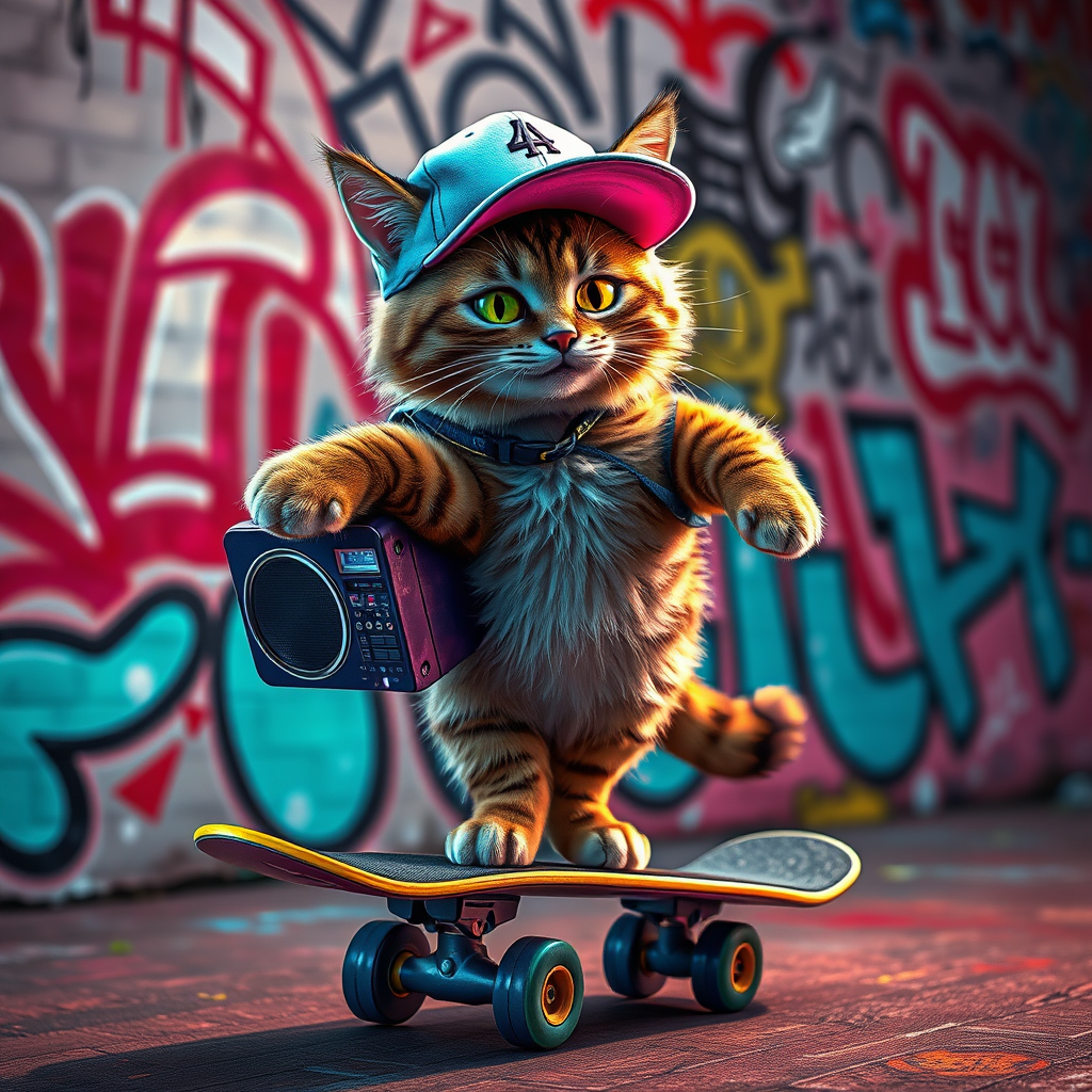 Cyberpunk style, a cool cat balancing on a skateboard, wearing a neon backwards baseball cap, clutching a boombox on its shoulder with a confident grin, vivid colors, graffiti-patterned background with an urban edge, playful and dynamic vibe, detailed intricacies, masterful composition in wide-angle 8K resolution, rendered with Octane and Ray-tracing, HDR10 for stunning color depth --ar 1:2 --s 1000.