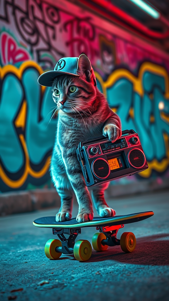 Cyberpunk style, a sleek cat rolling on a skateboard, donning a tilted baseball cap and effortlessly gripping a retro boombox, exuding a cool, confident vibe, vivid neon colors popping against a graffiti-covered wall's urban canvas, creating an edgy yet playful atmosphere, with detailed textures, capturing a high-quality artwork, masterful composition with a wide-angle view, rendered in stunning 8K resolution using Octane with precise Ray-tracing and HDR10, maintaining the immersive essence while adding a hint of futuristic flair.