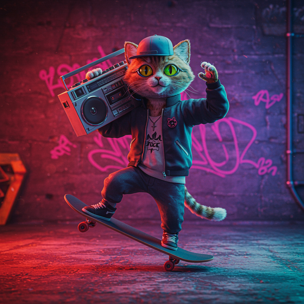 Cyberpunk style feline balancing effortlessly on a skateboard, adorned with a tilted snapback cap, clutching a vintage boombox against its shoulder, exuding a confident demeanor, surrounded by a vivacious palette of neon hues, against a backdrop of dynamic graffiti art, capturing an edgy yet whimsical tone, detailed intricacies shining through in high-quality artwork, masterfully composed with a touch of creative flair, presented in a wide-angle 8K resolution through Octane render and enhanced by Ray-tracing and HDR10 technology, maintaining a 1:2 aspect ratio with a spirited and audacious vibe.