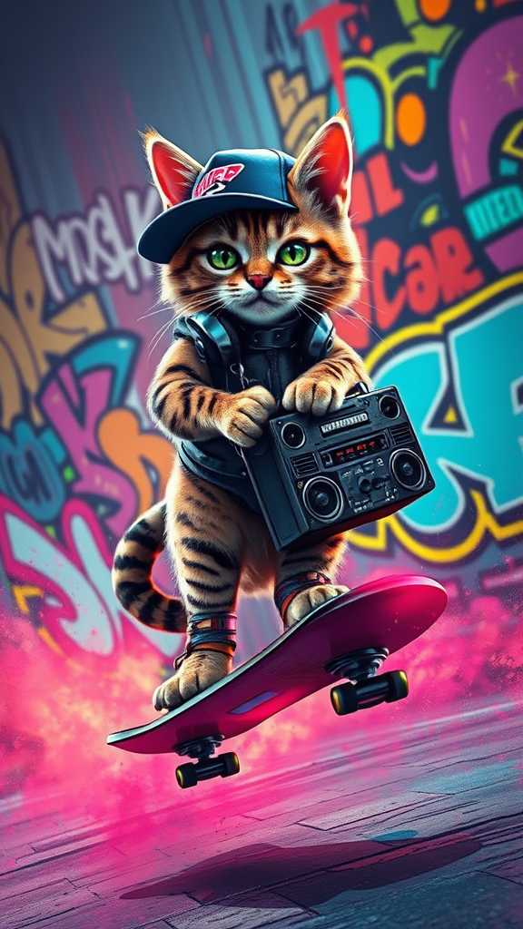 Cyberpunk style feline balancing on a hoverboard, sporting a sideways snapback cap and carrying a neon-accented boombox with futuristic speakers, showcasing a confident and mischievous expression, surrounded by an explosion of vibrant colors in a dynamic graffiti-style backdrop, capturing an edgy and playful mood with intricate details, high-quality artwork featuring masterful composition, rendered in a wide-angle 8K resolution using Octane render and Ray-tracing, enhanced with HDR10 for vivid visual depth, maintaining a striking and immersive aesthetic.