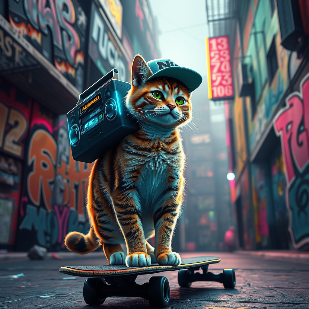 Cyberpunk style scene features a cat with a confident expression standing on a skateboard, its vibrant fur illuminated by neon lights. It's wearing a backwards baseball cap and expertly balancing a futuristic boombox adorned with holographic accents on its shoulder. The background is a dynamic, graffiti-laden urban landscape alive with detailed and intricate street art. The atmosphere is edgy yet playful, with the scene rendered in high-quality 8K resolution featuring Octane render techniques and cutting-edge ray-tracing. The entire composition bursts with vivid colors and shadow contrasts, enhanced with HDR10 quality, capturing an immersive and detailed cybernetic world at a wide-angle aspect ratio of 1:2.
