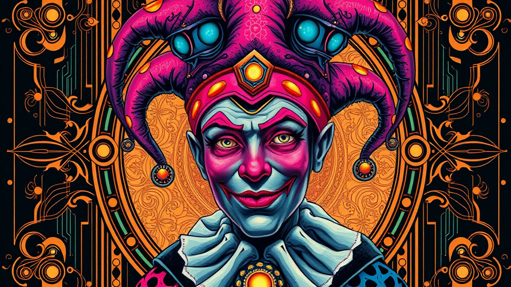 Cyberpunk tarot card featuring a portrait of a futuristic jester with a vibrant jester hat, illustrated in Art Nouveau style. The card is surrounded by an intricately detailed frame, embellished with cybernetic motifs and elegant patterns that resemble circuit boards. The jester's face is intricately detailed, capturing a mix of whimsy and tech-infused sophistication, with neon accents and holographic elements. The design is ultra-high definition, bringing out the vivid colors and complex textures in a 4K resolution. This concept art piece blends digital artistry with the elegance of traditional tarot, creating a visually stunning and highly detailed card that captivates the imagination.