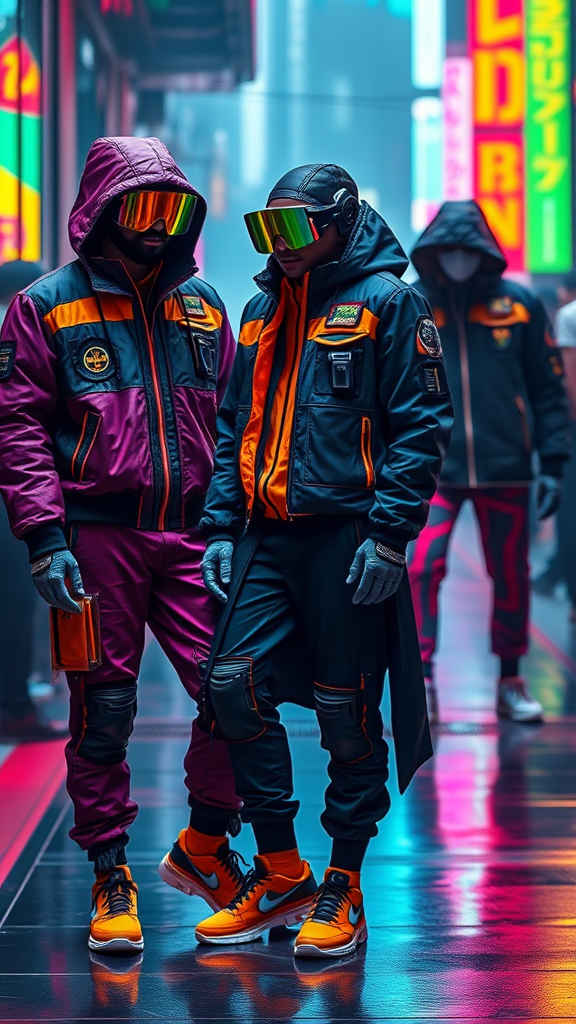 Cyberpunk techwear streetwear ensemble featuring a full view from head to toe, showcasing intricate details highlighted by the golden ratio. Vibrant colors infuse a hypermaximalist aesthetic within a futuristic setting. The look exudes luxury and elite status, blending cinematic flair with techwear fashion. Influences from Errolson Hugh, Nike ACG, Yohji Yamamoto, Y3, and ACRNYM add to the sleek design. The composition features a textured matte finish, embodying a seamless fusion of style and technology in a visionary cyberpunk narrative.