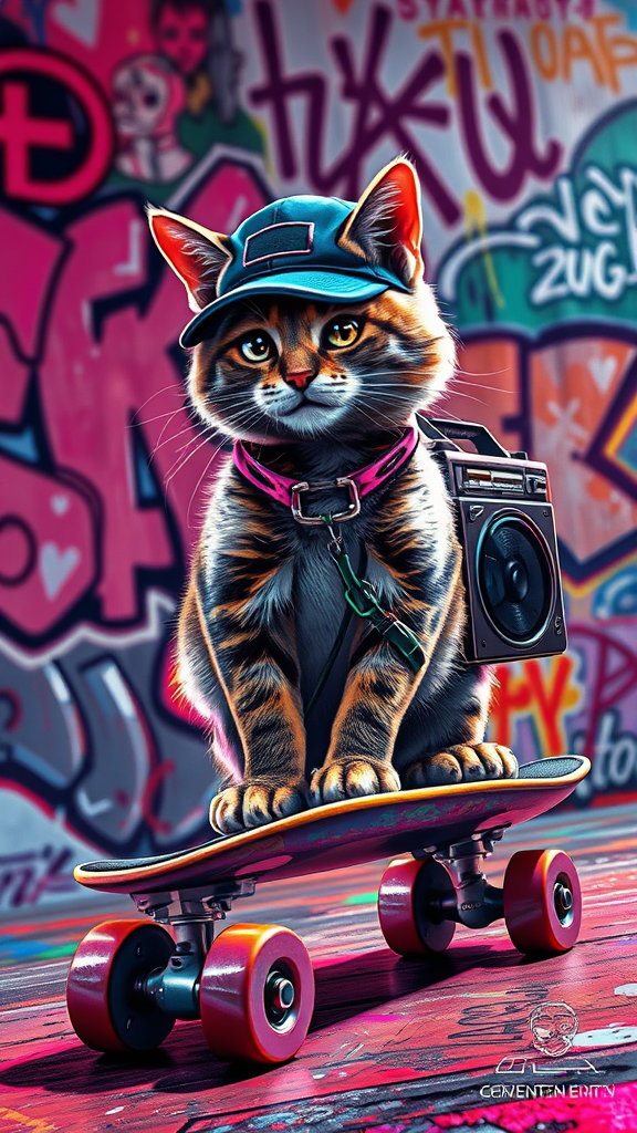 Cyberpunk theme featuring a cat on a skateboard, adorned with a backwards baseball cap, effortlessly balancing a boombox on its shoulder, exuding a confident expression. The scene is alive with vibrant colors against a graffiti-covered backdrop, creating an edgy yet playful atmosphere. The artwork is rich with intricate details, showcasing a masterful composition in wide-angle 8K resolution. Enhanced by Octane render, ray-tracing, and HDR10 technology, the scene captures every nuance of light and shadow.