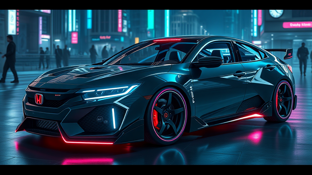 Cyberpunk-themed futuristic sedan inspired by the 2005 Honda Integra DC5, featuring a robotic aesthetic with sleek, minimalistic lines; concept art showcasing advanced technology and innovative car design; rendered in high detail using Artstation, Octane, and Unreal Engine; incorporating neon accents and a luminous underglow, aerodynamic structure with carbon fiber elements, advanced wheel designs, and an illuminated interior with holographic displays; capturing the essence of a futuristic urban environment in a 3D render—aspect ratio 3:2.