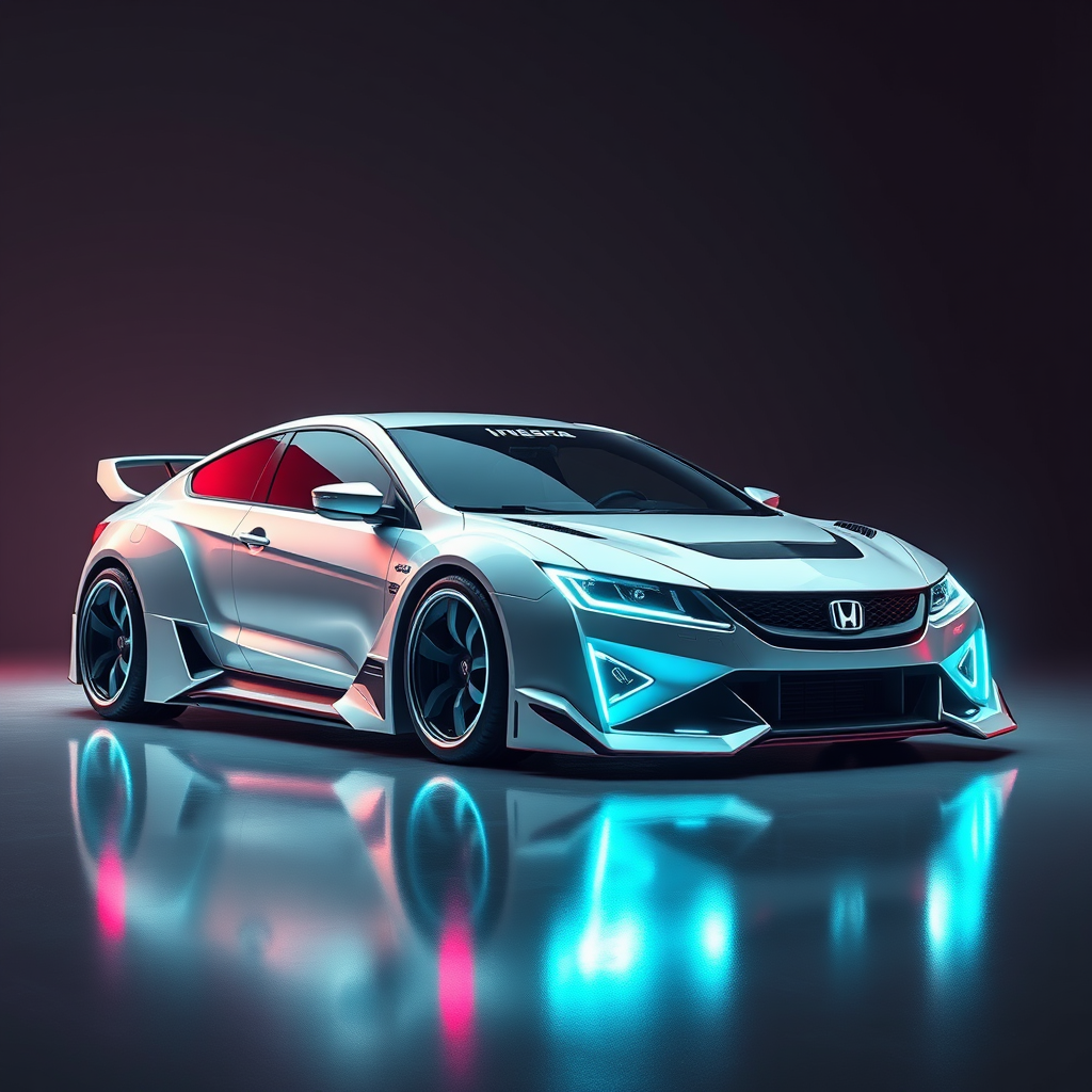 Cyberpunk themed sedan inspired by 2005 Honda Integra DC5, featuring a robotic and sleek design with minimalistic aesthetics. Conceptual art of a futuristic vehicle, showcasing cutting-edge technology and design elements. The car is rendered in high detail, highlighting its advanced aerodynamic structure and glowing neon accents. It incorporates a streamlined, agile form with seamless integration of digital interfaces and holographic displays. The lighting presents a dynamic, atmospheric feel with reflections and shadows enhanced by octane and Unreal engine rendering techniques. A vision of modernity and elegance in a cybernetic landscape.