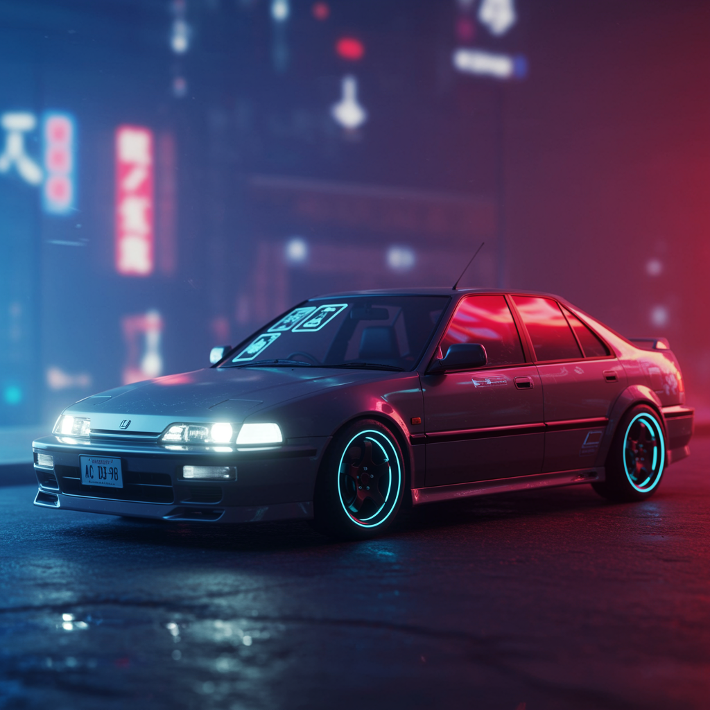 Cyberpunk themed sedan inspired by the 2005 Honda Integra DC5, featuring a robotic and sleek design. This concept art car showcases minimalistic yet striking aesthetics, highlighted by futuristic lines and glowing neon accents. The exterior is rendered with high detail in 3D, capturing an ultra-modern and aerodynamic shape. Utilizing advanced rendering techniques like Octane and Unreal, the vehicle boasts a polished, metallic finish that reflects the vibrant city lights. Small creative elements include transparent panels and integrated AI interfaces, enhancing the vehicle's high-tech allure. The design maintains the core inspiration while pushing the boundaries of innovative car design in a captivating 3:2 aspect ratio.