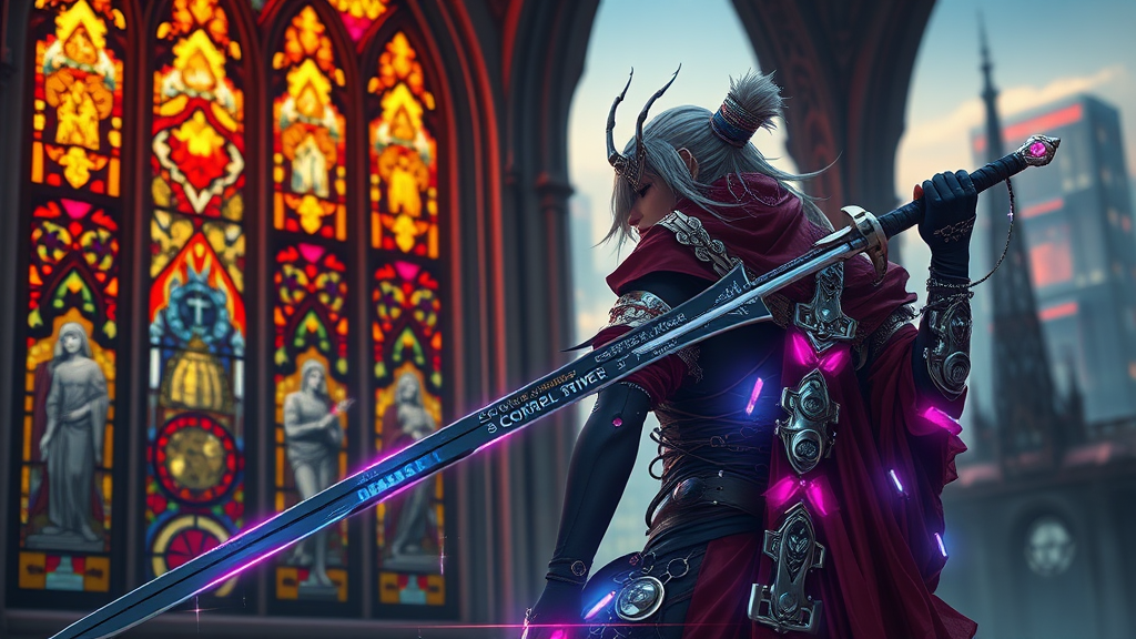 Cyberpunk warrior, medieval stained glass windows, crushed cyberdeck, shattered cicada implants, espeon, curved sword, stained glass church, airbnedic-resistant gown, Tokyo cityscape, shown in a stylized koosh-ball-esque style reminiscent of blazblue and soulcalibur, vibrant, absolutely photorealistic like the works of pete monarch and craig burnett, 4k render, sharp focus with subtle bokeh, trendy artstation, tekkon kinkreet, a dystopian future, fantasy electronics, hidden piercing, ultra-realistic octane env, appearance of darwin angelova, social feedback insights