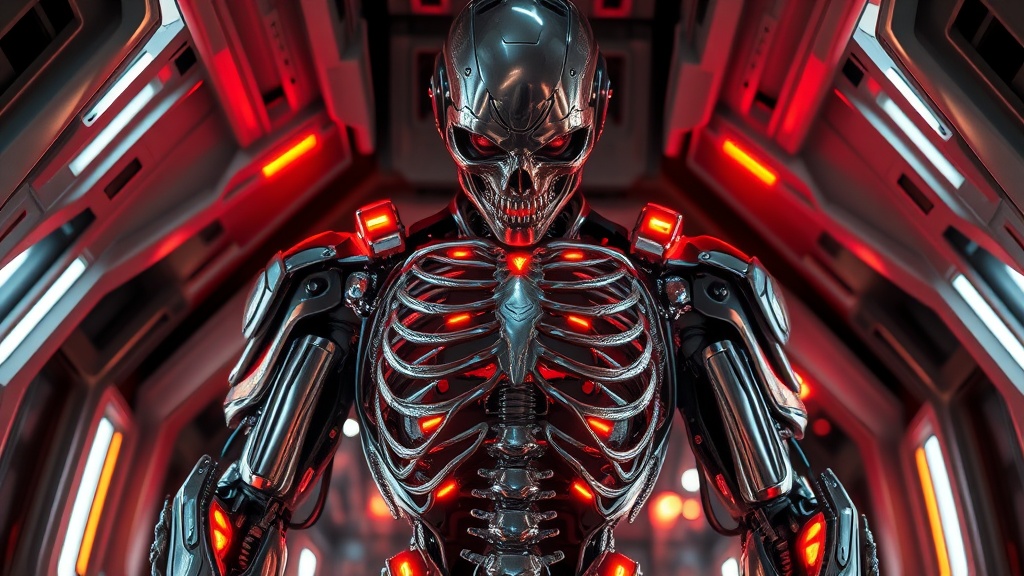 A hyperrealistic cyborg aboard a futuristic spaceship, featuring a complex design with anthropomorphic cybernetic skeleton motifs embedded within sleek metal armor. Neon light reflections dance across the highly detailed surfaces, enhanced by reflection mapping and intricate engravings. The scene is illuminated by dramatic, cinematic lighting that highlights the photorealistic textures and 8K resolution details, capturing every nuance of the cyborg's meticulously crafted structure. The aspect ratio emphasizes the towering presence of the figure within the high-tech environment.