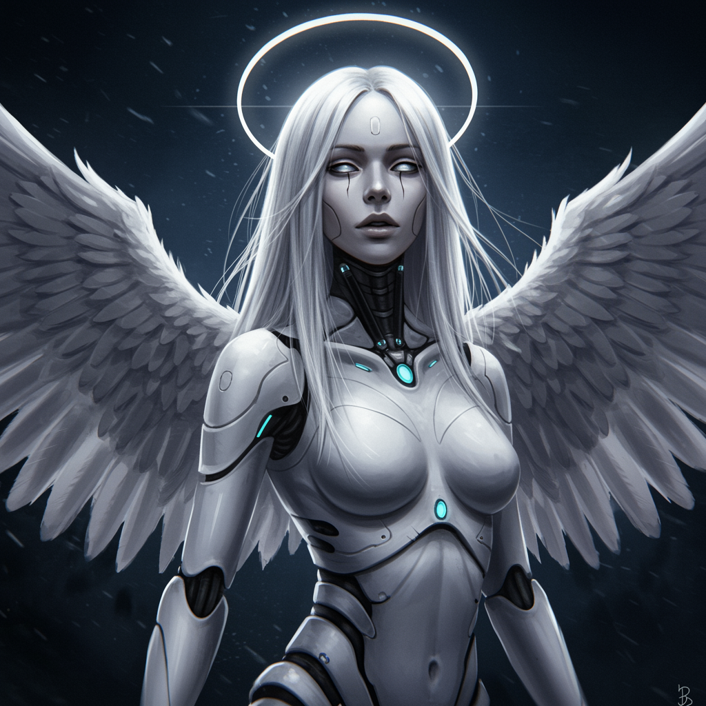 View this AI-generated image featuring a breathtaking cyborg angel with flawless expressionless features her ethereal presence enhanced by flowing silver hair cascading like liquid moonlight her sleek white armor glimmers subtly exuding both strength and celestial beauty set against a midnight backd