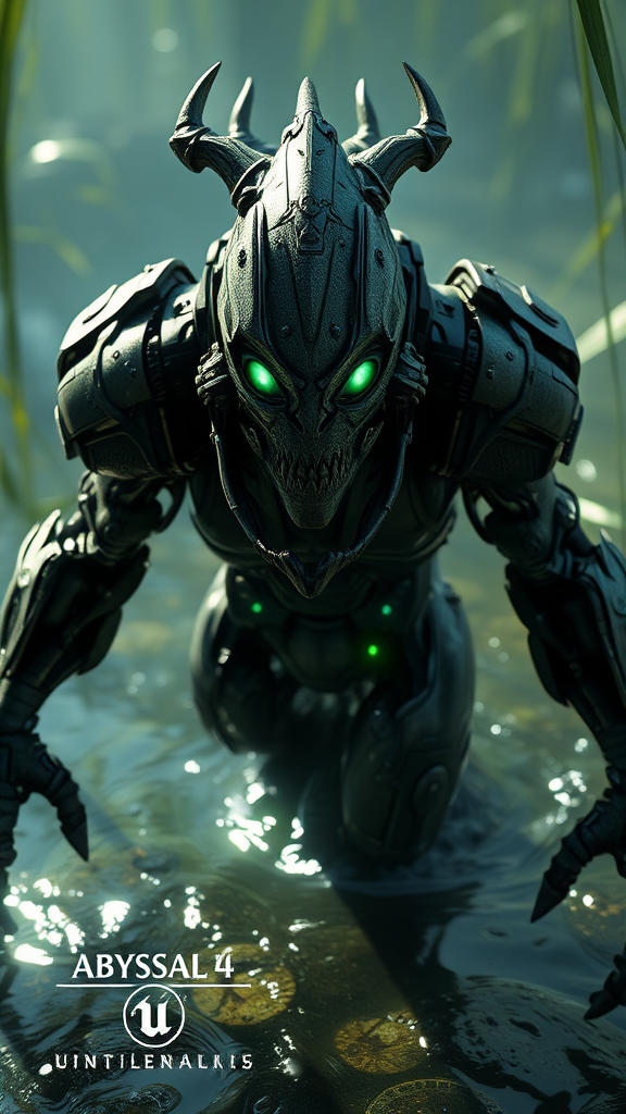 Cyborg Entity from the Abyssal Marsh, detailed biomechanical components, luminous emerald eyes, intimidating presence, aquatic humanoid form, glistening, slick, marshy backdrop, rendered in Unreal Engine 4, 3D, dramatic lighting.