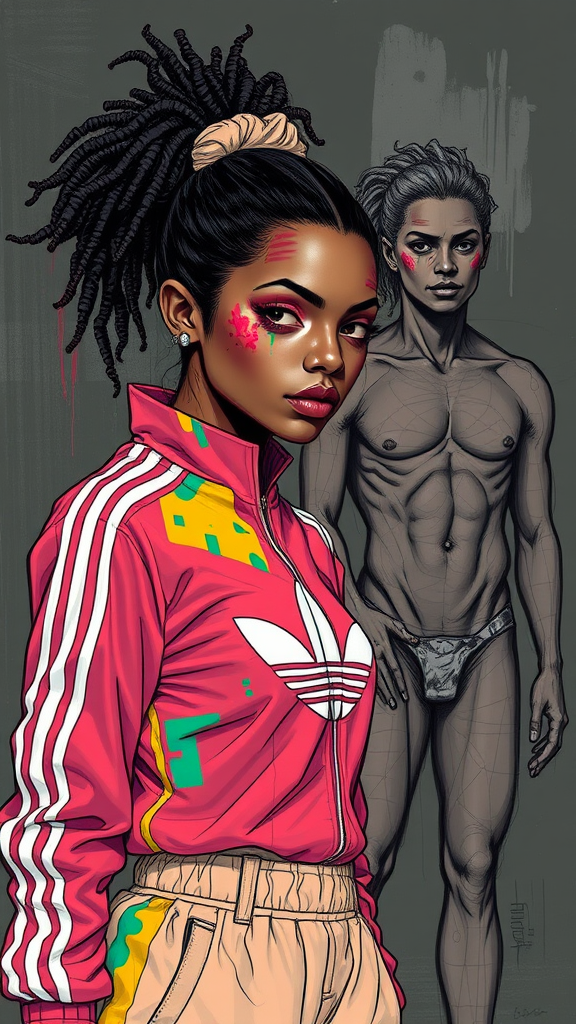 Cyborg girl inspired by Jean Michel Basquiat, adorned in a vibrant Adidas sportsuit embodying a sporty and rich 80s vibe, blends vintage photography aesthetics with elements of abstract and sketch art. Nearby, a nude black man evokes Manet's classic compositions, surrounded by cartoonish outlines and a hint of raw, unrefined energy.
