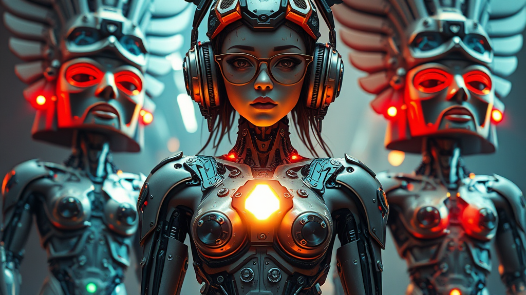 Cyborg girl, mechanical, heavily influenced by nuclear art, featuring gloss and depth of field with super detailed, cinematic cyberpunk lighting from multiple sources. She wears glasses, a headdress, and headphones, and has a flat chest, skinny build with narrow hips. Her design incorporates a bright, glowing element on her chest and a blinding light on her breasts, complemented by rivets and gold accents. The setting includes folded torsos, totem-like structures with dual faces and shared torsos, enhancing the fusion of human and machine. The imagery explores themes of mutation and transformation, while maintaining a sense of cinematic drama and intensity. Additional elements like heels, piercing, and lifeless expression add to the character, creating an arresting fusion of futuristic aesthetics and humanoid form.