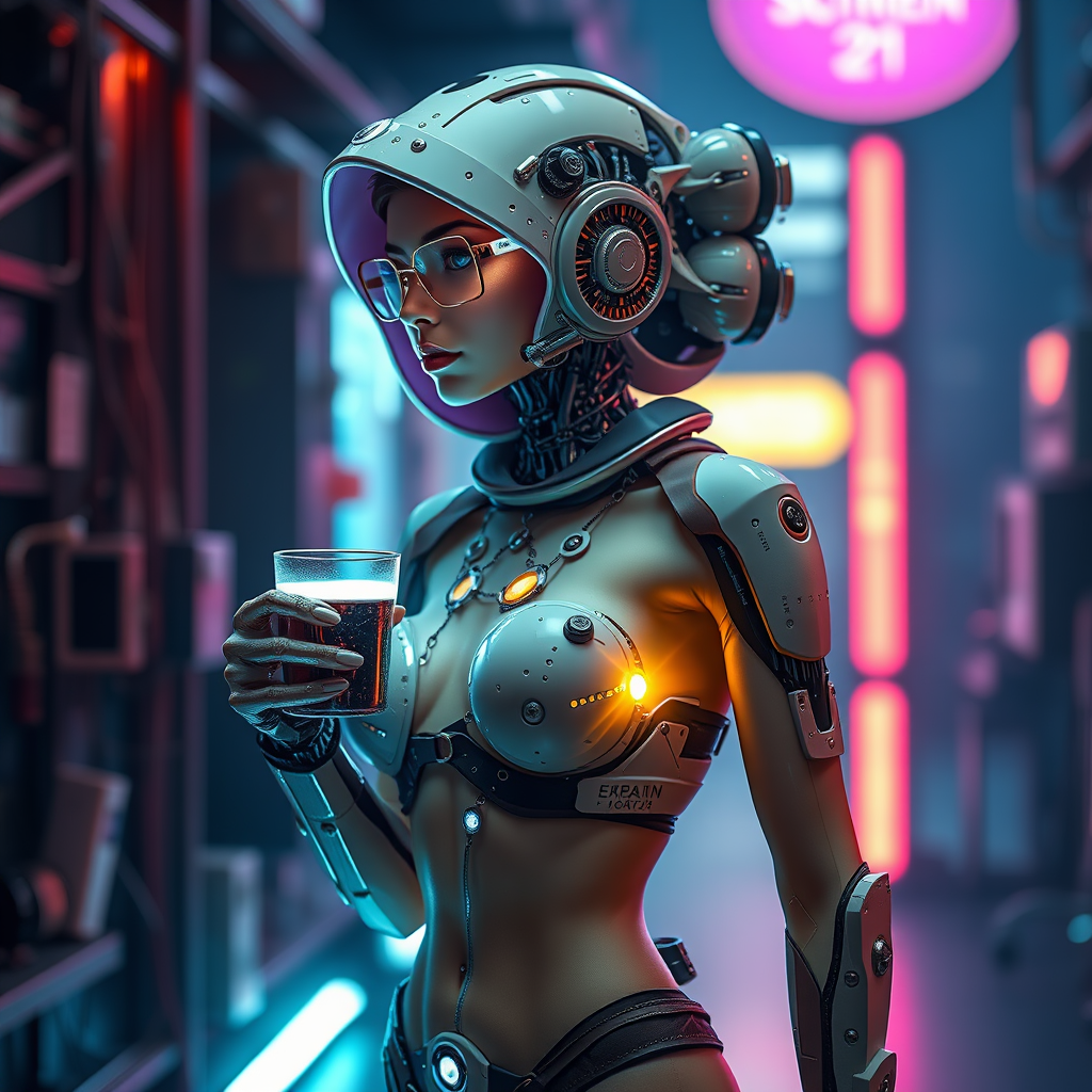 Cyborg girl with a focus on intricate mechanics and nuclear art, featuring glossy textures and depth of field for super detailed, cinematic imagery. Set in a cyberpunk environment with dynamic lighting from multiple sources, using a Mitakon Speedmaster 65mm lens at ISO 100. She has a sleek, flat chest and a skinny build, with glowing elements and piercing lights on her chest, contrasted by a hood and bright light accents. Accessories include glasses, mugs, and an elaborate headdress. Her bare neck and narrow hips emphasize her form, complemented by heels and radiant highlights. Gold rivets add a touch of elegance. The scene avoids deformities, ensuring refined anatomy and harmonious proportions throughout. Elements like cloudy eyes and lifeless expressions are removed to maintain a vivid and engaging visual style.