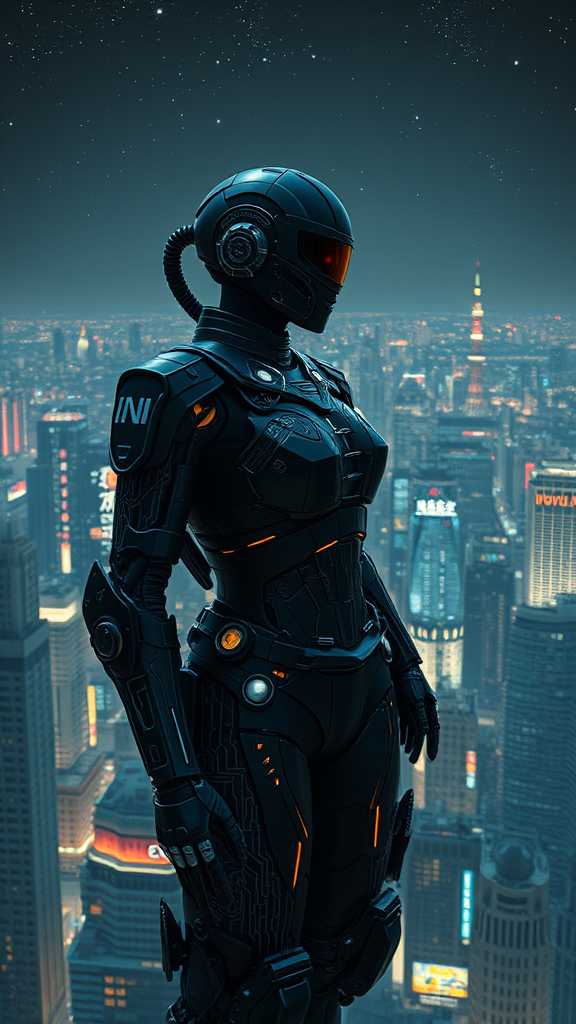 Cyborg Inspector Kageyama stands atop the neon-drenched skyscraper, her iris-less eyes scanning the desolate landscape of New Edo's darkened sprawl, the once-majestic cityscape now a dystopian tapestry of corporate gondolas and militarized sprawl, as stars twinkle like diamonds in the inky blackness above. She wears a bespoke ensemble of matte black armor, each plate etched with intricate circuitry branching like 80s digital art, pulsing with soft, ethereal light as she exhales a careful diagnosis of her surroundings.