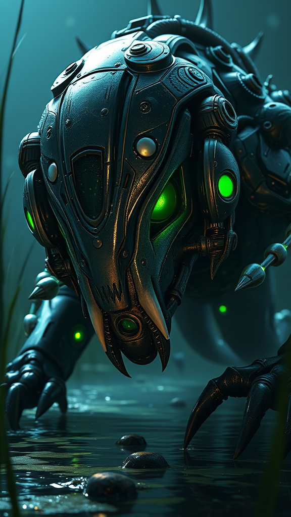 Cyborg monster from the murky depths, detailed mechanical features, vibrant emerald eyes, intimidating presence, aquatic beast design, glistening, slick, marshy backdrop, rendered in Unreal Engine 4, three-dimensional, dramatic lighting effects.