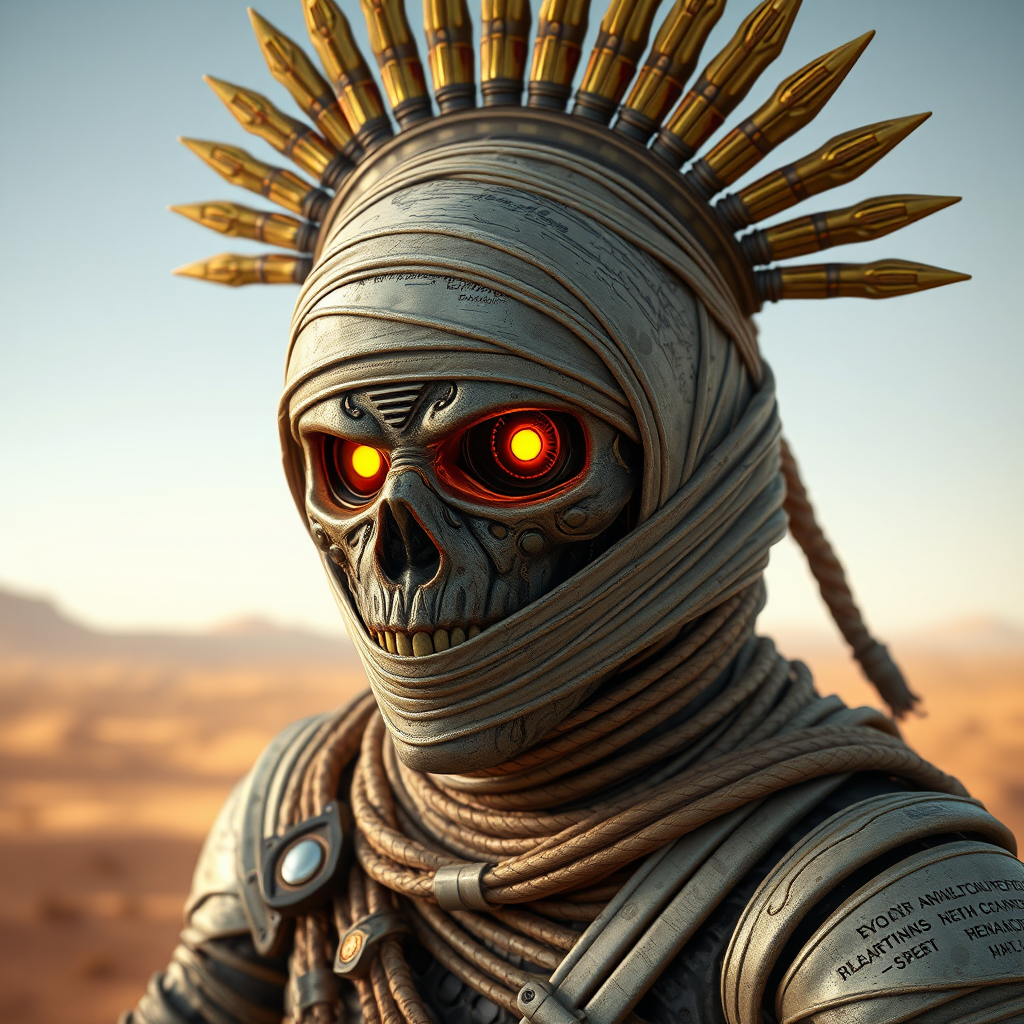 Cyborg mummy, detailed robotic features, luminous amber eyes, intimidating presence, enshrouded in ancient bandages, adorned with a radiant gold headdress, set against a vast desert landscape, rendered in Unreal Engine 4 with 3D cinematic lighting and subtle modern enhancements.
