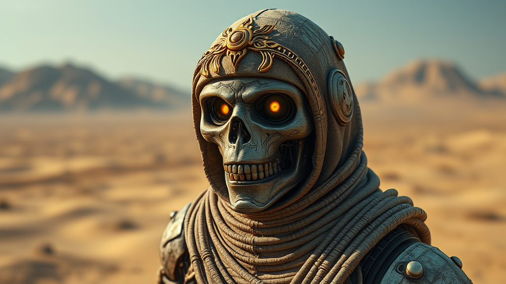 Cyborg mummy with complex robotic features, piercing luminous eyes, an intimidating presence, encased in aged bandages, adorned with a lavish golden headdress, set against a vast desert landscape, rendered using Unreal Engine 4 with a 3D cinematic lighting effect, subtle changes in texture to reflect a blend of ancient and futuristic elements.