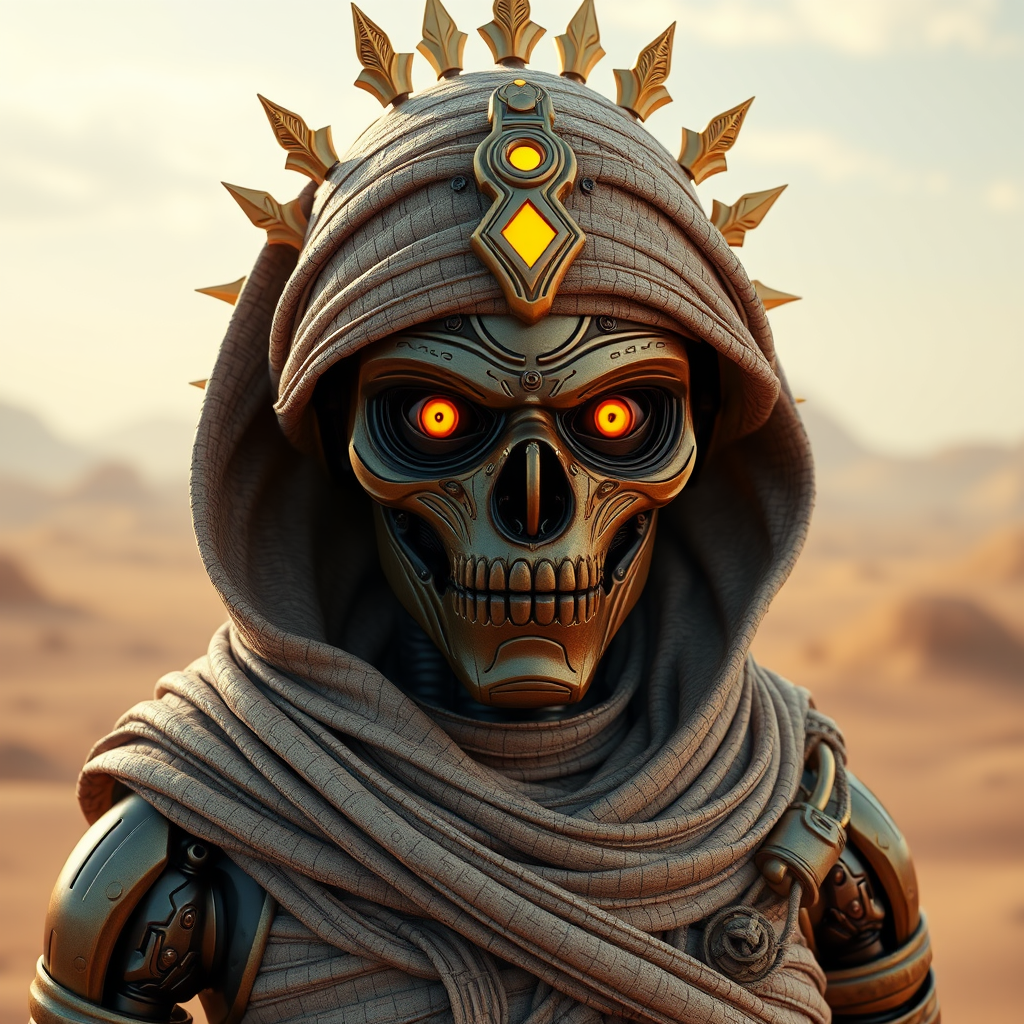 Cyborg mummy with detailed robotic features, piercing yellow eyes, and a formidable expression, enveloped in ancient bandages, adorned with a radiant gold headdress, set against a vast desert landscape, rendered in Unreal Engine 4 with 3D cinematic lighting.