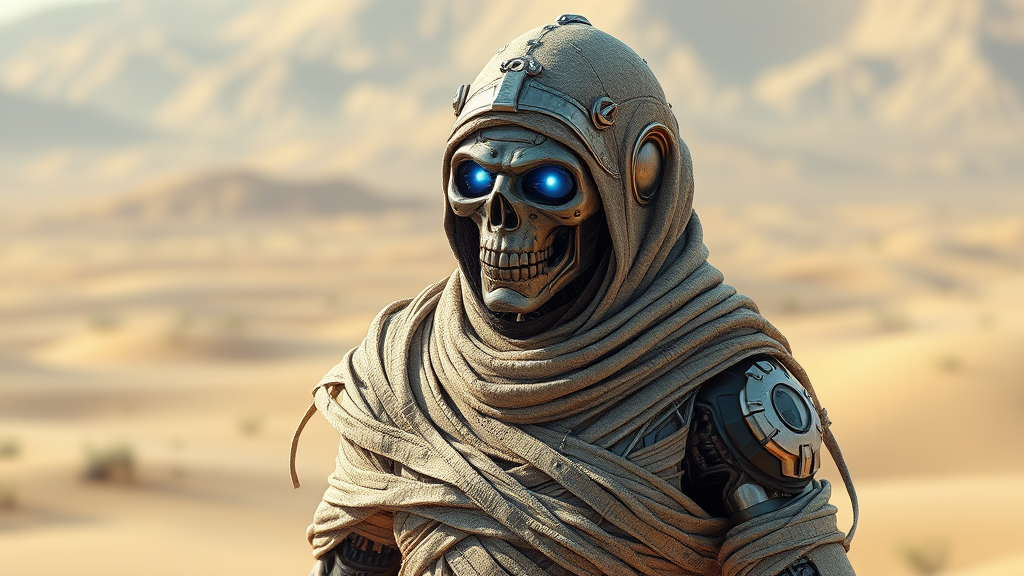 Cyborg mummy with intricately detailed robotic features and glowing blue eyes, exuding a haunting presence. Wrapped in tattered bandages and adorned with a silver headdress, it stands against a vast desert landscape. Designed in Unreal Engine 4, the scene is brought to life with dynamic 3D elements and dramatic cinematic lighting.