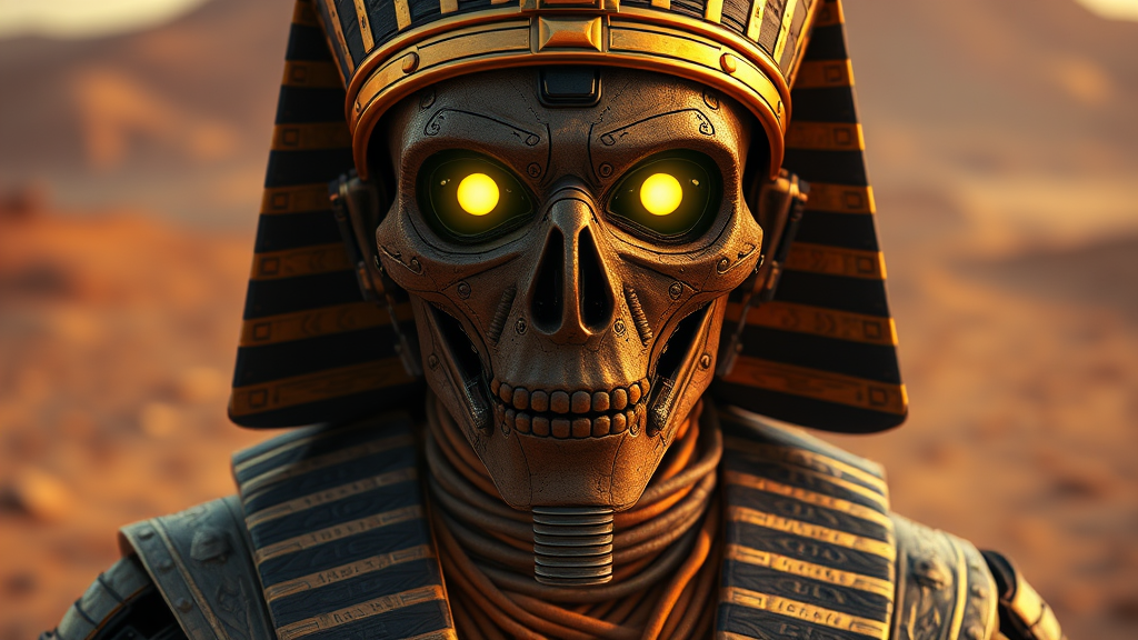Cyborg pharaoh mummy, detailed cybernetic enhancements, piercing neon yellow eyes, intimidating presence, encased in ancient bandages, ornate gold headdress, vast desert backdrop, rendered in Unreal Engine 4 with cinematic 3D lighting, atmosphere of mystery and power.