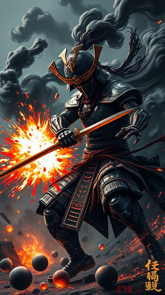 Cyborg samurai warrior engaging in battle, executing a powerful strike against foes, emanating swirling jet black smoke clouds, vibrant color explosions abound, exquisitely detailed, dark and moody environment, atmospheric intensity, hyper-realistic with intricate textures, ray tracing cartoon technique enhancing depth and dimension, blending technology and tradition seamlessly.