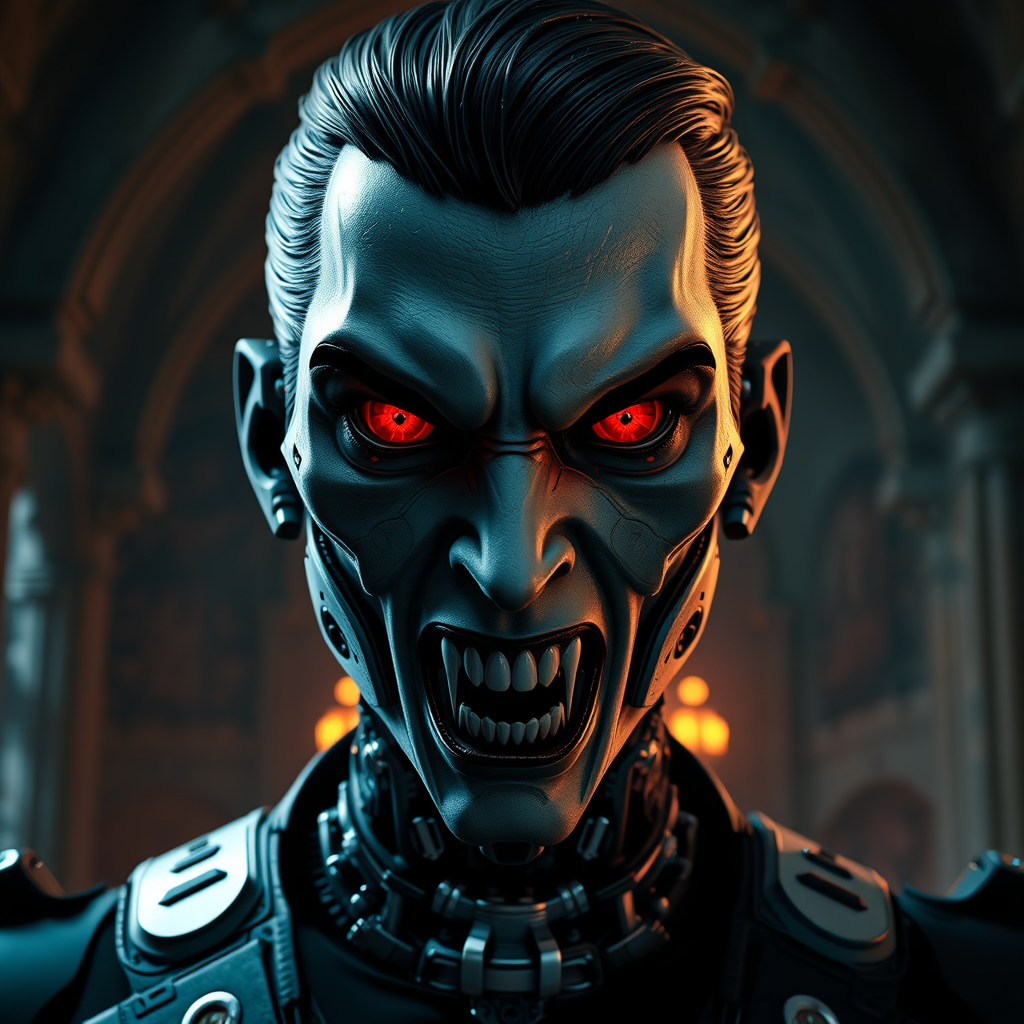 Cyborg vampire with complex mechanical features, piercing crimson eyes, and a sinister expression, displaying sharp fangs, slicked-back short dark hair, set in a foreboding castle interior, rendered with Unreal Engine 4, featuring dramatic lighting for a cinematic effect.