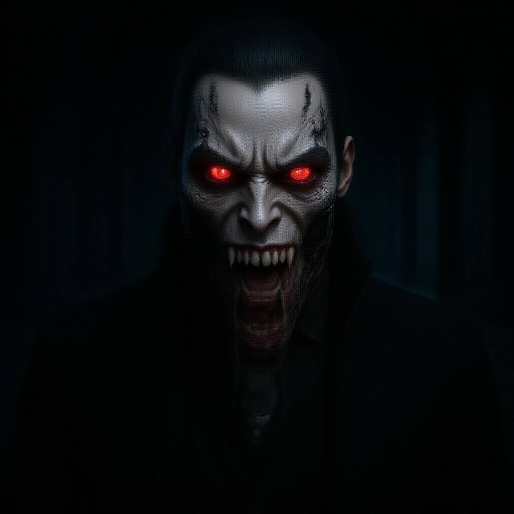 Cyborg vampire with complex robotic features, piercing red eyes, and a sinister expression, mouth agape to reveal razor-sharp fangs, hair slicked back and jet black, set against the shadowy backdrop of an ancient castle interior, rendered in Unreal Engine 4 with cinematic lighting for a 3D effect.