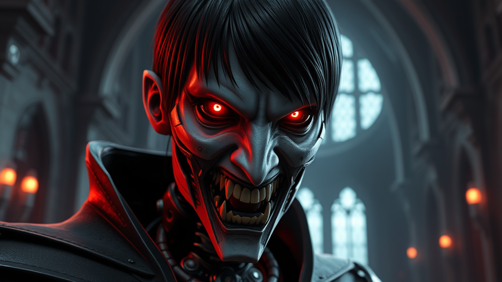 Cyborg vampire with detailed mechanical features, piercing red eyes, intimidating expression, bared sharp fangs, sleek short black hair, set within a gloomy castle interior, crafted using Unreal Engine 4, 3D artistry, featuring dramatic cinematic lighting.