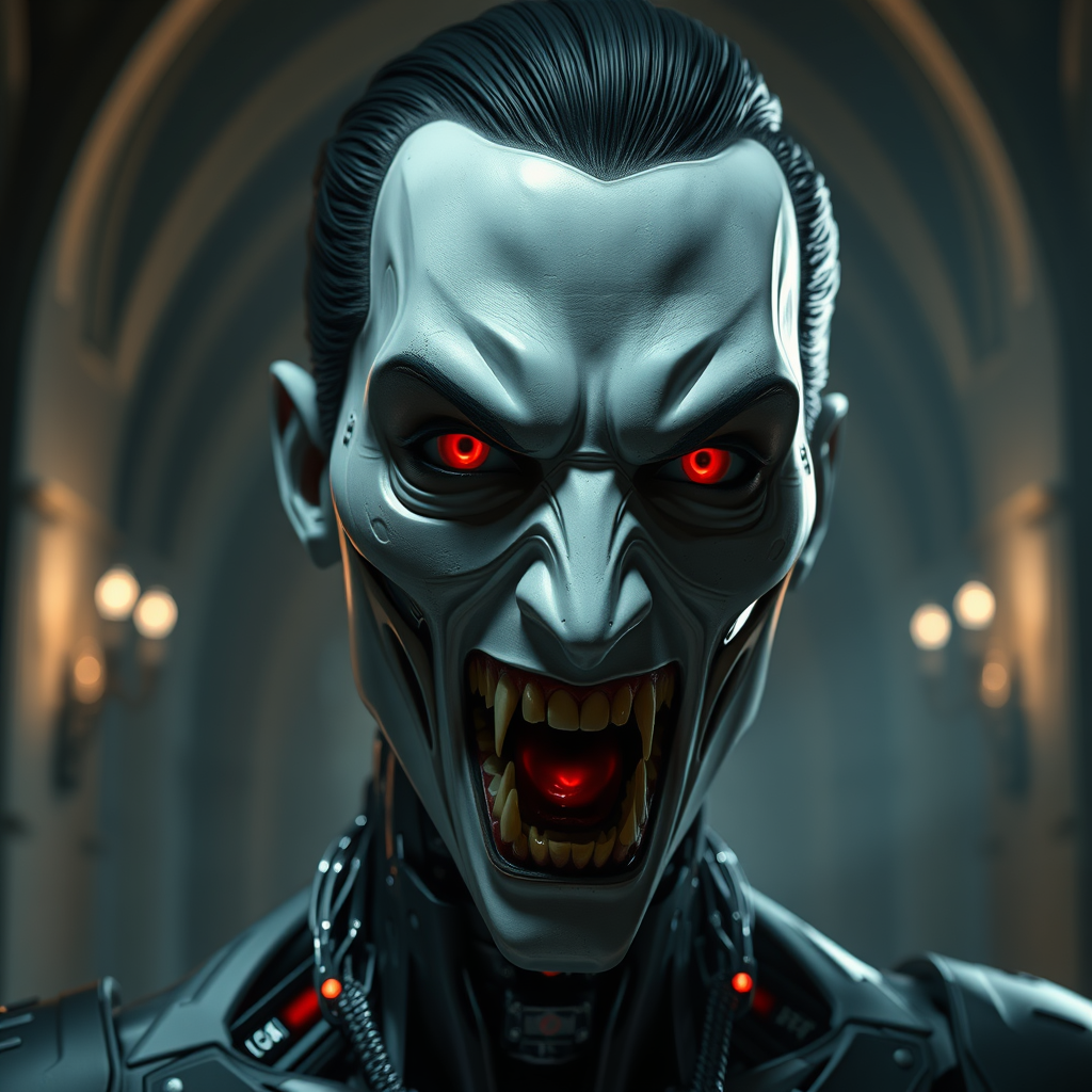 Cyborg vampire with highly detailed robotic features, piercing crimson eyes, and a sinister expression, mouth agape revealing razor-sharp fangs, with stylishly slicked back short jet-black hair. Set against the backdrop of a dimly lit, ancient castle interior, designed to resemble a cinematic scene rendered in Unreal Engine 4, enhanced with dramatic, atmospheric lighting.