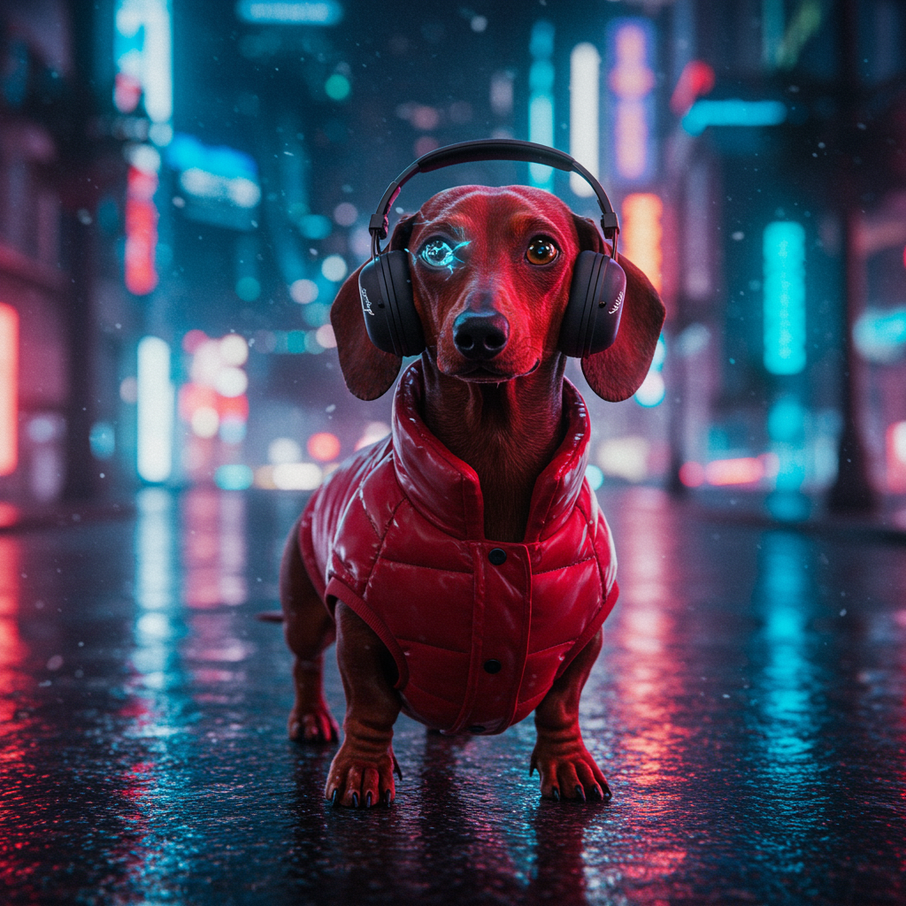 A sleek dachshund with a glossy red coat stands confidently on the wet street of a futuristic city, where neon lights reflect off the rain-soaked ground. One eye sparkles an electric blue, while the other is a warm, earthy brown. The dog is enveloped in a snug, vibrant red puffer jacket that adds to its eye-catching appearance. Large, stylish Marshall headphones rest over its ears, hinting at the immersive soundscapes of the advanced world it inhabits. The backdrop features towering skyscrapers with holographic advertisements and shimmering LED pathways, creating a vivid and dynamic cityscape.